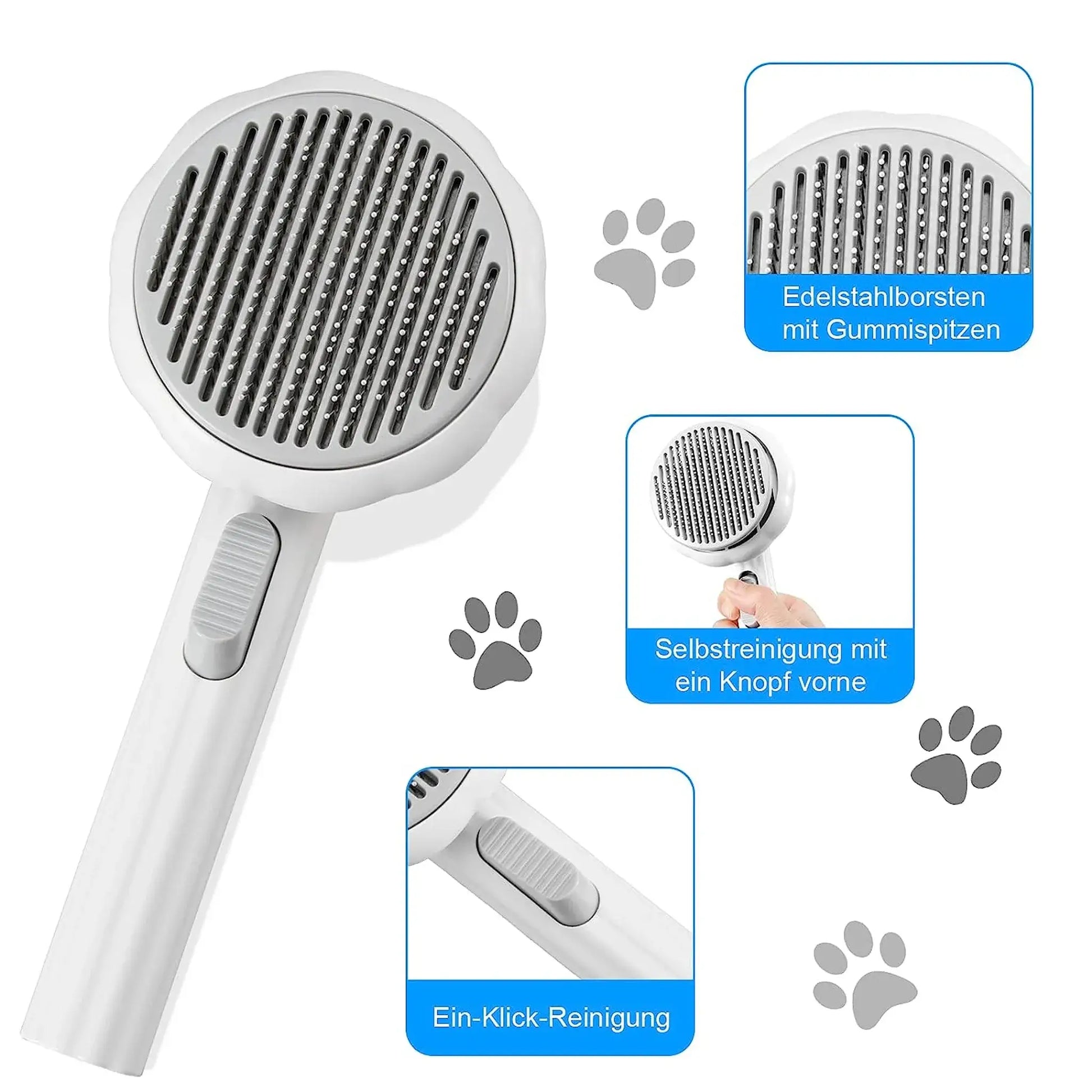 Eenvoudig schoon te maken: Elke keer dat je de massagekam gebruikt om je huisdier te kammen, kun je het huisdierhaar eenvoudig loslaten dat op de zelfreinigende borstel is verzameld met een druk op de knop.
